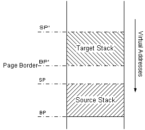 Для того чтобы не создавать отдельный сегмент стека для выполнения каждого междоменного вызова, АМВ использует стек, на котором поток, производящий данный вызов, выпонялся в исходном домене. Вершина стека выравнивается по границе страницы и полученный адрес интерпретируется как дно нового стека (см. рисунок). Таким образом, после перехода в целевой домен поток продолжает выполняться на том же стеке, что и в исходном домене, но при этом содержимое исходного стека изолировано от вызываемого объекта.